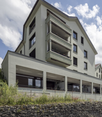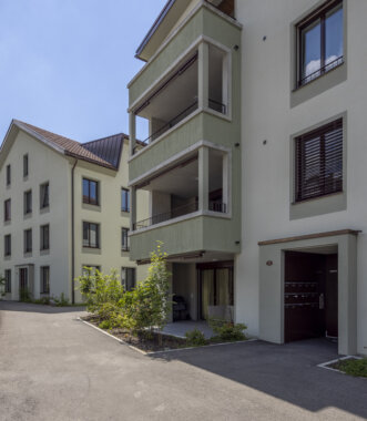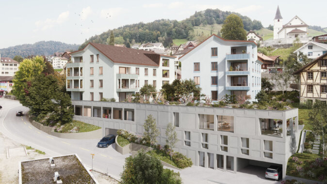 Setzung, Volumetrie und Gestaltung der Mehrfamilienhäuser orientieren sich an der ortsspezifischen Architektur. Proportionen und Fassadenelemente geschützter Bauten im Dorf werden aufgegriffen und mit modernen Ansprüchen des Wohnungsbaus vereint. Vielseitiger und attraktiver Wohnraum unterschiedlicher Grösse für Eigentümer und Mieter unterstreicht künftig den dörflichen Charakter. Die Umgebungsfläche umspielt die Neubauten mit Wiese, Obstspalieren, einer Spielfläche und gezielt platzierten Bäumen.