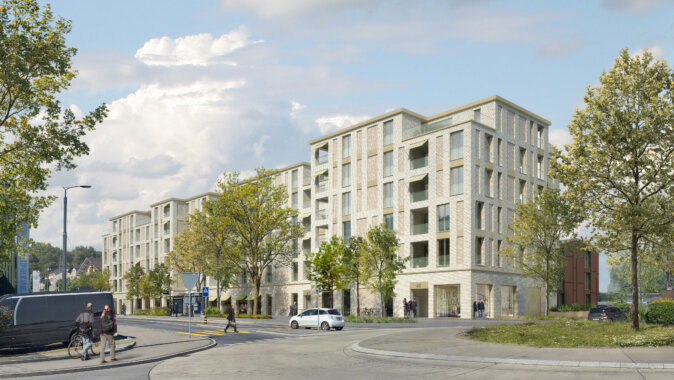 Der strassenbegleitende Längsbau ist mit Vor- und Rücksprüngen rhythmisiert und gliedert das lange Volumen in einzelne Gebäudeabschnitte. Das Erdgeschoss wird als Sockelgeschoss ausgebildet, das durch seinen architektonischen Ausdruck auf die öffentlichen Nutzungen verweist. Die darüberliegenden Wohnungen sind durchgehend angeordnet mit ruhigen Räumen auf der Gartenseite. Entlang der Kaspar-Kopp-Strasse werden drei identische Gebäudekörper dem Strassenverlauf folgend aufgefächert. Diese Bauten integrieren sich bezüglich Massstäblichkeit in die Nachbarschaft.