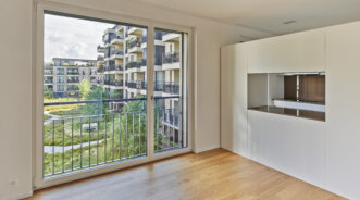 Mit dem Bau der Wohn- und Geschäftshäuser auf Baufeld E findet die Entstehungsgeschichte der Tribschenstadt ihren Abschluss. Die beiden Gebäudewinkel beherbergen Wohn- und Atelierräume für insgesamt 111 Mieter. Dazwischen generiert die halb unterirdisch platzierte Tiefgarage eine Plattform, die als formensprachlich natürlich angelegter, grüner Innenhof die städtische Wohnqualität ergänzt.