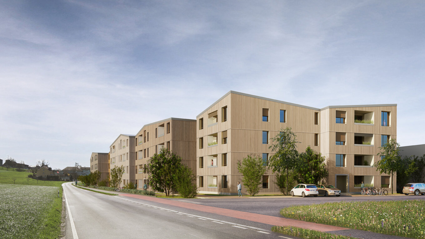 Das Projekt enthält 44 Wohnungen und optionale Gewerbebauten. Die neuen Wohnbauten bilden kräftige Volumen an der Urswilstrasse in einem für den Ort neuen Massstab. Die Gebäudelängen werden durch Versätze und eine bewegte Dachlandschaft zum Strassenraum hin aufgebrochen und gliedern somit die Baukörper zurück in die vertraute Massstäblichkeit der Umgebung.